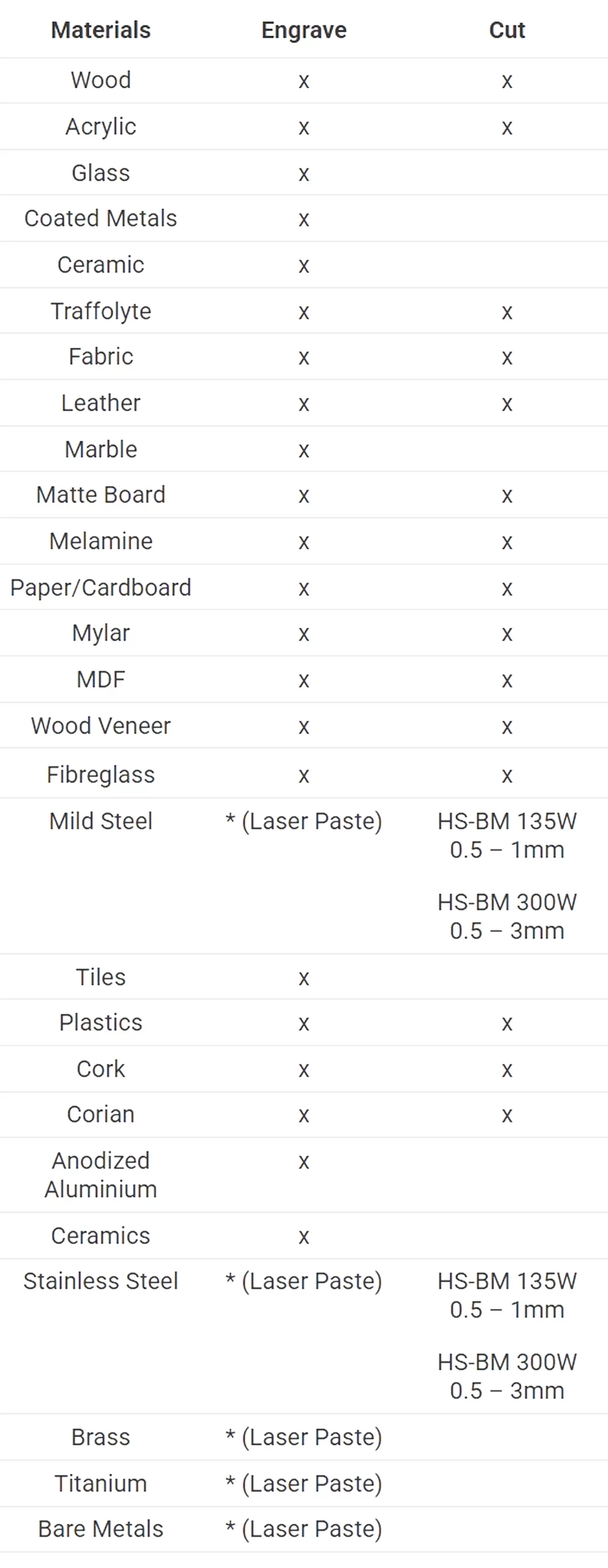 Notes: Engrave * indicates that the marking process will require the use of a laser paste or spray. For non-production cutting of Mild Steel & Stainless Steel have a look at our combination C02 Laser: 135W & 300W Lasers.
