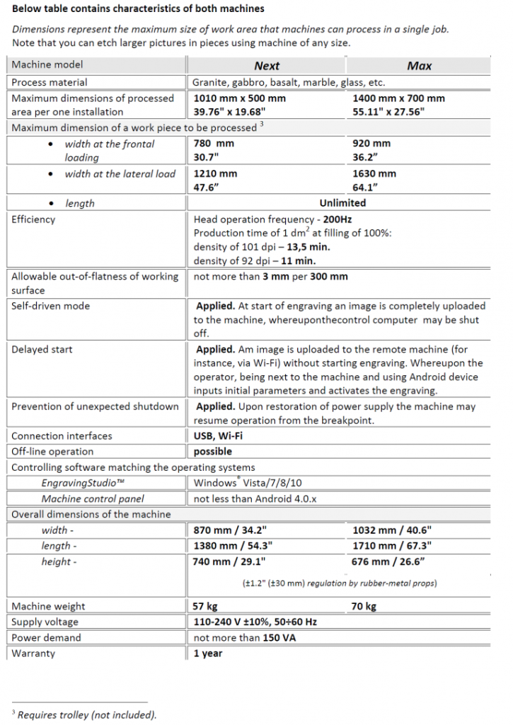 The D-Graver Granite Sprint is a portable machine that sits on top of the stone. It is capable of etching a design 400mm x 600mm in size. The smaller D-Graver cube model can etch up to 300mm x 400mm.D-Graver Granite Next can etch up to 1010 x 500mm and D-Graver Granite Max 1400 x 700mm.